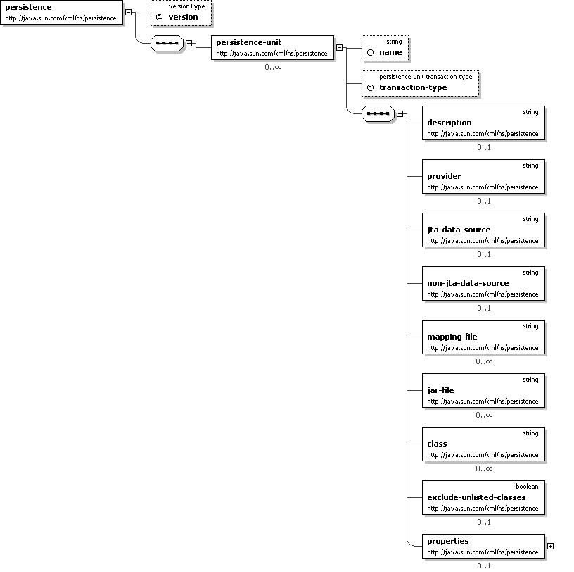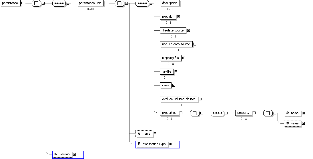 version="1.0 [1]"> <persistence:persistence-unit </persistence:persistence>name=" xsd:string [1] 'Name used in code to reference this persistence unit.' "transaction-type=" persistence:persistence-unit-transaction-type [0..1] 'Type of transactions used by EntityManagers from this persistence unit.' "> [0..*]<persistence:description>
